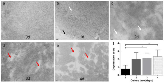 Degeneration score in static porcine retina culture for 4 d. (a) After isolation, retinae showed an integer structure without holes or clefts. (b) On day 1 of culture, the tissue was still of good quality, but for the brighter areas we can assume cell loss occurred (white arrow). Tissue borders were particularly exposed to degeneration (black arrow). (c) On day 2, degeneration became significant by bright spots, demonstrating lower cell density, i.e., cell loss (white arrows). (d) Degeneration further increased on day 3 and bright areas progressed to holes (red arrows). (e) After 4 d of culture, multiple holes and clefts demonstrated progressed tissue degeneration (red arrows); nevertheless, it must be noted that tissue assembly was still intact. (f) Degeneration was quantified by the degeneration score. Though degeneration progressed over time, it never reached the highest score of ‘3’, i.e., a destruction of the tissue assembly. Significant differences were found for 1 vs. 3 and 1 vs. 4 d of culture (p = 0.0496 and p = 0.0234, respectively). N = 5–8. Magnification: 200×; scale bar: 200 µm. * = p < 0.05. [37].