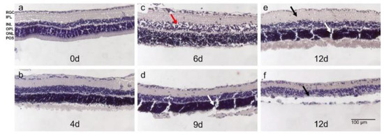 Morphology of H&E-stained rat retinae in static 12-day-long culture. (a) Retinae stained directly after isolation showed the typical laminar structure without signs of degeneration; POS were present. (b) On day 4, tissue quality was comparable to directly stained retinae without significant signs of degeneration and preserved laminar structure. (c) POS showed signs of degeneration after 6 d of culture. However, other retinal layers were preserved despite some holes indicating cell loss (red arrow). (d) Until day 9 of culture, tissue integrity was maintained without significant signs of degeneration except for the loss of POS. (e,f) At 12 d of culture, degeneration became significant. Either retinae thickened indicating inflammatory processes (black arrow €(e)) or cell loss was significant and retinal layers, particularly INL and ONL, were no longer distinguishable (f). Clefts in (d,e) (white arrows) were due to tissue processing. N = 3. Magnification: 100×; scale bar: 100 µm [43].