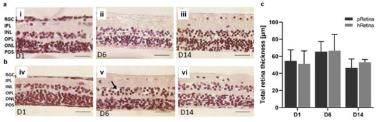 Morphology and thickness of H&E-stained porcine and human retinae after static culture for 14 d. Sample isolation and tissue processing were improved (Section 2.2.5) allowing for a 14-day-long culture. Shown are H&E-stained retinal sections from day 1 to day 14. (a) The presented sections illustrate the quality of retinae at the time point of isolation, at 6 and 14 d. On day 1, layers were distinguishable, no signs of degeneration were seen (i). Moreover, on day 6, retinae look normal, though little cell loss might have occurred in the INL and ONL (ii). POS were present. After 14 d of culture, POS were no longer visible in H&E-stained sections, but laminar retinal structure was still intact (iii). N = 16. (b) The presented sections illustrate the quality of retinae at the time point of isolation, at 6 and 14 d. On day one, all layers were distinguishable, and no signs of degeneration were seen (iv). On day 6, retinae look normal without significant signs of degeneration, though little cell loss might have occurred in the INL and ONL (black arrow) (v). POS were not visible. After 14 d of culture, laminar retinal structure was still intact (vi). N = 8. (c) Retinal thickness was determined in porcine and human retinae cultured for 14 d using micrographs of H&E-stained samples. It did not differ significantly over 14 d; an ANOVA excluded significant changes between time points for both porcine (pRetina) (p = 0.4882) and human (hRetina) tissue (p = 0.6126). Magnification: 400×; scale bar: 50 µm [44].