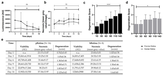 Cell viability, death, and degeneration in static culture of p- and hRetinae for 14 d. (a) The curves show luminescence measured in culture media of p- and hRetinae over 14 d. While luminescence remained low in hRetinae, it was high at the beginning in pRetinae, followed by a decrease. Luminescence inversely correlated to viability, indicating a high cell viability (or low cell death rate) for both species, except for within the first week in pRetinae. (b) Necrosis was determined by PI-staining, revealing low and stable rates of necrosis for both species from day 1 to 14. (c) Degeneration in cultured pRetinae increased over time but remained moderate with a maximum increase up to 2.13 (p < 0.0001). (d) In hRetina, degeneration remained stably low, with scores from 1.03 to 1.60 (p = 0.0290). (e) Individual values of viability, death, and degeneration analyses. * = p < 0.05; **** = p < 0.0001. [44].
