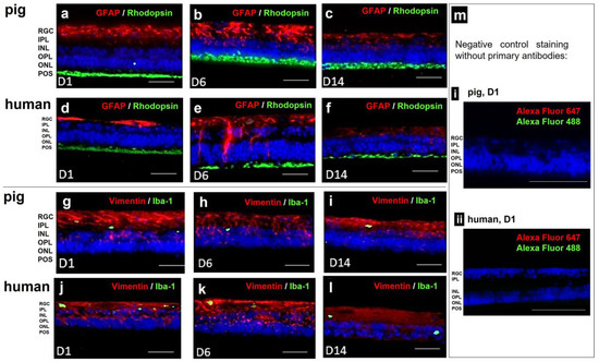 Immunohistochemical staining of p- and hRetinae from 1 to 14 d of culture. (a–f) Anti-GFAP-anti-rhodopsin double-staining confirmed POS preservation up to day 14 (green). GFAP staining revealed inflammatory reactions in Müller cells on day 6 of culture which decreased in the second week of culture below base staining (red). The pattern was similar for pRetinae and hRetinae. (g–l) Vimentin staining proved stable Müller cell presence and morphology for 14 d (red). Microglia activation, shown by Iba-1+ cell staining (green), remained low in both species at every time point. (m) The two micrographs (i,ii) show representative negative control staining without primary antibodies, but the two used secondary antibodies Alexa Fluor 647 (red) and Alexa Fluor 488 (green). N = 16 (pRetinae); N = 8 (hRetinae). Magnification: 200×; scale bar: 100 µm [44].