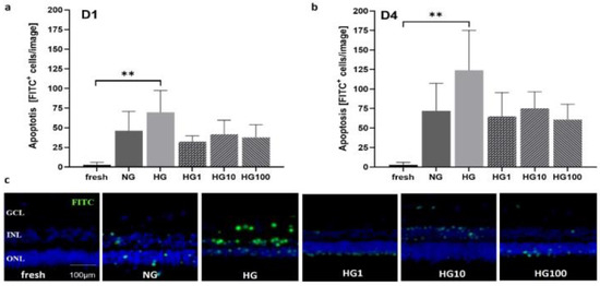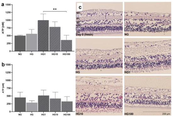 Anti-oxidative cell protection by scutellarin in HG conditions. pRetinae were cultured for 4 d in static conditions (Model 3) in NG (6 mM) or HG conditions (30 mM) and treated with scutellarin (1, 10 or 100 µM). (a) Viability determined on day 1 (D1) revealed comparable ATP level in both glucose conditions, but significantly increased viability after treatment with low (1 µM) or medium (10 µM) doses of scutellarin, while high doses (100 µM) had a detrimental effect. (b) On day 4 (D4), viability decreased in HG, but increased after addition of low and medium doses of scutellarin to levels of NG. (c) H&E staining of retinal sections fixed on day 4 of culture (plus one control fixed immediately after isolation: “fresh”), revealed a lowered degeneration in POS of scutellarin-treated samples if administered in low to medium doses. NG = normal glucose; HG = high glucose; HG1 = high glucose + 1 µM scutellarin; HG10 = high glucose + 10 µM scutellarin; HG100 = high glucose + 100 µM scutellarin. N = 4. Magnification: 200×; scale bar: 200 µm. ** = p < 0.01. [37].