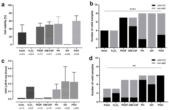 OS in rat retinae incubated with H2O2 and treated with PEDF and/or GM-CSF. Retinae were treated for 3 d with PEDF and/or GM-CSF before incubation with H2O2 on day 3. On day 4, viability and GSH levels were analyzed. Many samples were significantly degenerated and did not deliver technically valid results; thus, the number of valid results was analyzed as an additional parameter. (a) Highest viability was detected in tissue treated with both proteins (after H2O2 incubation), followed by the PH group, GM-CSF, and PEDF. Untreated, “normal” tissue without H2O2 incubation had second lowest level. In H2O2 and GH groups, no valid results were measured. (b) The number of valid viability measurements of data shown in (a) was increased in samples not H2O2 incubated and PEDF/GM-CSF treated. The number of valid results decreased in PH and PGH groups, and no valid results were received in H2O2 and GH groups. (c) Lowest GSH levels were measured in the fresh, PEDF, and GM-CSF groups. Medium levels were detected in H2O2 and PH groups, while highest GSH levels were determined in GH and PGH groups. (d) The percentages of valid GSH assay results of data shown in (c) were highest in groups PH, GH, and PGH, followed by H2O2. The lowest percentages were seen in groups fresh, PEDF, and GM-CSF. N = 3–8. PH = PEDF + H2O2; GH = GM-CSF + H2O2; PGH = PEDF + GM-CSF. A chi-square test for trend was performed, showing significant differences for the viability analysis (p < 0.0001) and for the GSH assay (p = 0.0069). ** = p < 0.01; **** = p < 0.0001.