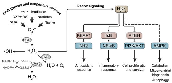 Generation of reactive oxygen species (ROS) and redox signaling. Many endogenous and exogenous sources favor the generation of superoxide and hydrogen peroxide. Enzymes that comprise the cellular antioxidant system (SOD, CAT, and GPx) transform these oxidants into less dangerous molecules. Low to moderate levels of hydrogen peroxide participate in several biological processes including the regulation of antioxidant response, inflammatory response, cell proliferation and survival, metabolic adaptation, and autophagy. Indirect processes are indicated by dashed arrows. AMPK, AMP−activated protein kinase; CAT, catalase; CYP, cytochrome P450; GPx, glutathione peroxidase; GSH, glutathione; GSSG, glutathione disulfide; IκB, inhibitor of NF−κB; KEAP1, Kelch−like ECH−associated protein 1; NF−κB, nuclear factor−κB; NOX, NADPH oxidase; Nrf2, nuclear factor erythroid 2−related factor 2; OXPHOS, oxidative phosphorylation; PI3K, phosphatidylinositol 3−kinase; PTEN, phosphatase and tensin homolog; SOD, superoxide dismutase.