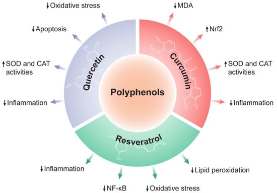 Oxidative stress is implicated as a primary cause of disease and a contributor to disease progression [19]. The non-physiological production of ROS leads to the exhaustion of antioxidant defenses and is associated with many pathologies, including Alzheimer’s disease [20], cancer [21], type 2 diabetes mellitus (T2DM) [22], aging [23], and liver diseases [24]. The loss of hepatic function that occurs during many liver conditions, such as hepatotoxicity [25], liver ischemia-reperfusion (I/R) injury (LIRI) [19], non-alcoholic fatty liver disease (NAFLD) [26], and hepatocellular carcinoma (HCC) [27], is associated with oxidative stress due to excessive production of ROS. Liver dysfunction involves the disruption of whole-body homeostasis; it causes disturbances in inter-organ crosstalk and can lead to death [28]. Recovering liver function or ameliorating the severity of liver pathologies is crucial to improving the health and life expectancy of patients with such diseases. Oxidative stress is a common factor in liver pathologies; therefore, understanding the molecular mechanisms underlying redox signaling in liver diseases will contribute to the development of novel therapeutic strategies to prevent them and ameliorate their complications. The investigation of natural products, such as polyphenols, is an attractive and promising strategy for modulating oxidative stress in liver diseases. Polyphenols, found in plants and fruits, have been shown to have a protective role against environmental stressors and to regulate ROS-mediated signaling pathways [29,30]. In the current review, we describe the effects of quercetin, resveratrol, and curcumin on the amelioration of oxidative damage that occurs during NAFLD, LIRI, and HCC and discuss how they can be attractive therapeutic compounds under such conditions.