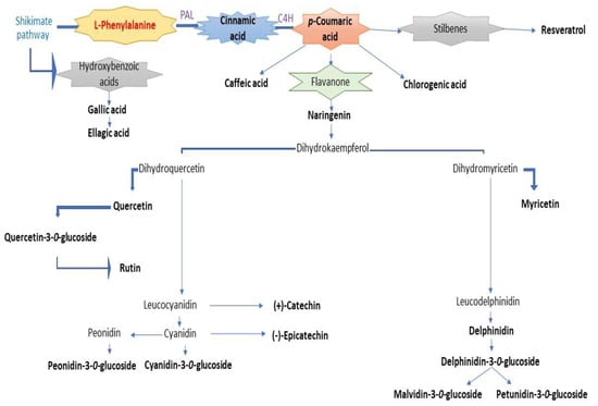 Red wines are alcoholic beverages that contain a variety of natural bioactive compounds with antioxidant properties. The most important antioxidant role among wine components is attributed to polyphenols, but they are also responsible for the organoleptic properties of red wine: the colour [1], bitterness, astringency [2], taste [3], and aroma [4]. These compounds with different chemical functions and structures are secondary metabolites in red wines, biosynthesised via the shikimate pathway and/or phenylpropanoid metabolism [5]. The major steps in phenylpropanoid metabolism are the reactions in which phenylalanine undergoes deamination catalysed by phenylalanine ammonia lyase (PAL) to yield trans-cinnamic acid and the hydroxylation of cinnamic acid catalysed by cinnamic acid 4-hydroxylase (C4H) to yield p-coumaric acid [6]. The p-coumaric acid is an essential compound in further reactions involved in the biosynthesis of various classes of polyphenolic compounds [7] found in red wines (Figure 1). Red wines contain different types of polyphenols that are extracted from the grapes during winemaking. For example, the phenolic acids (hydroxybenzoic acids and hydroxycinnamic acids) are present in the pulp, seeds, and skins of the grapes [8], with the skins [9], the stilbenes [10], and flavonols [11] found in the skins, the flavan-3-ols concentrated in all the solid parts of the grapes (skins, stems and seeds) [12], and the anthocyanins mainly enriched in the skins [13]. The grape varieties, the yeast used in the fermentation of the wine, the contact with the wood, and the ageing processes all have an influence on the concentration and composition of the polyphenolic compounds in the finished wine [14]. Thus, during the winemaking process, the biosynthesis and accumulation of secondary metabolites due to phenylpropanoid pathways can be observed, leading to a change in the composition of polyphenolic compounds.