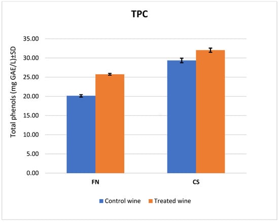 It can be noted that the results obtained for the total TPC (Figure 2) are in agreement with the results of the HPLC analyses of the polyphenolic compounds. As in the HPLC analyses, higher content values were obtained for the wines treated with melatonin, 24% in the case of the FN wine and 9% each in the case of the CS wine. The values for the gallic acid equivalent (GAE) also agreed with those of the HPLC analysis, giving 32.3 ± 0.54 GAE mg L−1 for the treated CS wines and 25.75 ± 0.20 GAE mg L−1 for the treated FN wines.