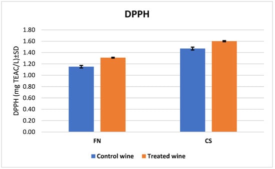 Figure 3 shows that melatonin use increased the ability to scavenge DPPH free radicals, with the highest increase for wine FN at 14% and for wine CS at 9%. Moreover, an agreement with the results for TPC was observed, and the data values found were higher for CS wines (1.47 ± 0.03 TEAC mg L−1 for the control wine and 1.60 ± 0.01 TEAC mg L−1 for the treated wine) than for the FN wines (1.15 ± 0.02 TEAC mg L−1 for the control wine and 1.31 ± 0.01 TEAC mg L−1 for the treated wine).