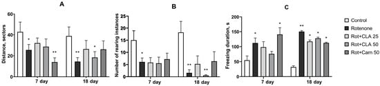 On day 7, the duration of freezing episodes (Figure 2C) in the “Rotenone” group was 112.2 ± 16.7 s versus 54.7 ± 14.3 s in the control (p = 0.032), and by day 18, it increased even further—150.5 ± 69.3 s versus 32.0 ± 4.1 s in control (p < 0.001). The administration of carnosine and CLA did not significantly affect this parameter; however, on day 7, the freezing duration in the “CLA 50” group (8.2 ± 2.2 s) did not significantly differ from both the intact animals or the “Rotenone” group. On day 18, this parameter was reduced relative to the “Rotenone” group in animals of all groups receiving the investigated compounds, and the significance of differences from control animals was p = 0.01, while the “Rotenone” group differed from intact ones with p < 0.001.