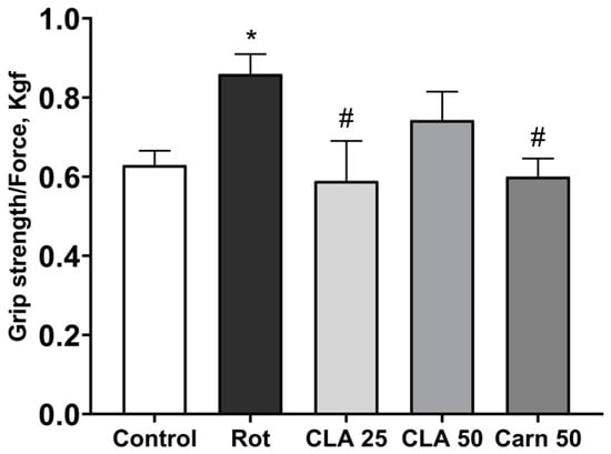 Evaluation of animal strength in the grip strength measurement test. *—p < 0.05 compared to the control group. #—p < 0.05 compared to the “rotenone” group in univariate analysis using Dunnett’s correction for multiple comparisons.