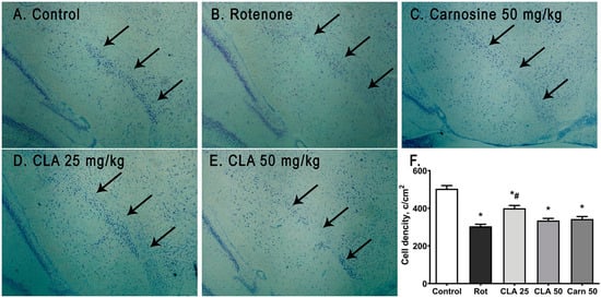 Photographs of neurons stained according to the Nissl method in the SNpc (marked with arrows), brain section: (A) intact animal; (B) animals who received subcutaneous injections of rotenone; (C) animals who received subcutaneous injections of rotenone and intraperitoneal injections of the CLA complex at a dose of 25 mg/kg of body weight; (D) animals who received subcutaneous injections of rotenone and intraperitoneal injections of the CLA complex at a dose of 50 mg/kg of body weight; (E) animals who received subcutaneous injections of rotenone and intraperitoneal injections of carnosine at a dose of 50 mg/kg of body weight; (F) neuron density count data in the SNpc, stained according to the Nissl method. *—differences from intact animals with p < 0.0001; #—differences from animals that received rotenone with p = 0.0001.
