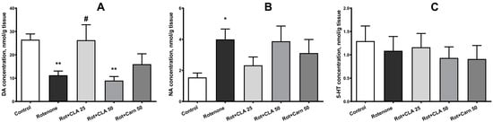 Effect of subcutaneous administration of rotenone, accompanied by the administration of carnosine (50 mg/kg) or carnosine-lipoic acid (CLA) complex (CLA) (25 and 50 mg/kg) for 18 days on the content of neurotransmitters: (A) dopamine (DA), (B) noradrenaline (NA), (C) serotonin (5-HT) in the striatum of experimental animals. *—differences from intact animals with p < 0.05, **—p = 0.01; #—differences from animals that received rotenone with p < 0.05.