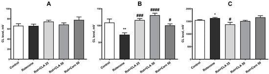 As such, administration of the studied compounds in conjunction with rotenone did not affect animal weight. The most significant weight loss was observed among animals belonging to the “CLA 50” group, which may be due to a CLA overdose.