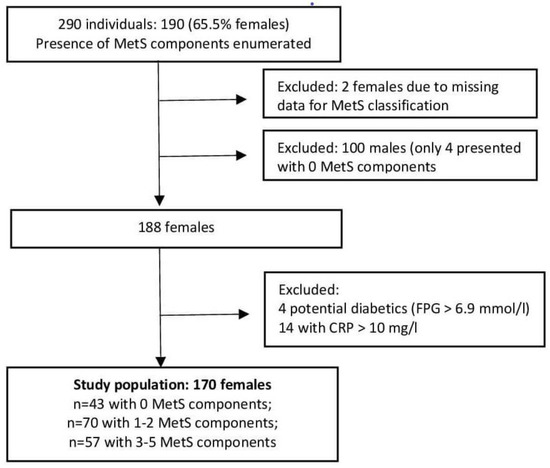 Variables characterizing oxidative and inflammatory markers were determined in 290 participants. The presence of MetS components was enumerated according to the following criteria: central obesity—waist/height ratio (WHtR) ≥ 0.5 [58]; increased BP—systolic BP (SBP) ≥ 130 mm Hg or diastolic BP ≥ 85 mm Hg; elevated fasting plasma glucose (FPG ≥ 5.6 mmol/L); elevated TAG (≥1.7 mmol/L); low HDL-C (females: <1.3 mmol/L; males: <1.0 mmol/L) [5]. Two females with missing data for an accurate classification of MetS status were excluded. Subjects presenting with ≥3 MetS components were then considered to be suffering from MetS; pre-MetS was classified as the manifestation of one or two components; individuals not displaying a single component served as controls (CTRL). Only four males presented with zero MetS components, so this analysis was conducted only in females. After the exclusion of 18 subjects (4 potential diabetics (FPG > 6.9 mmol/L) and 14 presenting with CRP > 10 mg/L), 170 females remained for the analysis (Figure 1).