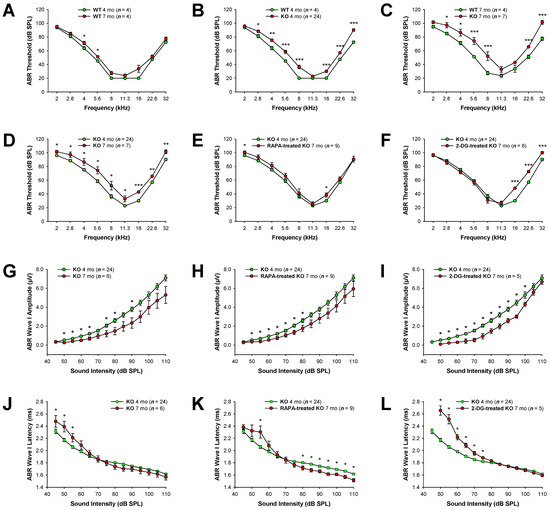 Figure 1. Auditory brainstem responses (ABRs) in rapamycin- and 2-DG-treated Fus1 KO mice. (AF) Shown are graphs illustrating the average ABR threshold as a function of stimulus frequency in (A) WT mice at 4 and 7 months of age; (B) WT and KO mice at 4 months of age; (C) WT and KO mice at 7 months of age; (D) KO mice at 4 and 7 months of age; (E) untreated and rapamycin-treated KO mice; (F) untreated and 2-DG-treated KO mice. (GI) Shown are I/O function graphs of the average amplitude of ABR wave I as a function of sound intensity at 16 kHz in (G) KO mice at 4 and 7 months of age; (H) untreated and rapamycin-treated KO mice; (I) untreated and 2-DG-treated KO mice. (JL) Shown are I/O function graphs of the average latency of ABR wave I as a function of sound intensity at 16 kHz in (J) KO mice at 4 and 7 months of age; (K) untreated and rapamycin-treated KO mice; (L) untreated and 2-DG-treated KO mice. Data are presented as mean ± SEM. * = p < 0.05, ** = p < 0.01, *** = p < 0.001 (Student’s t-test).