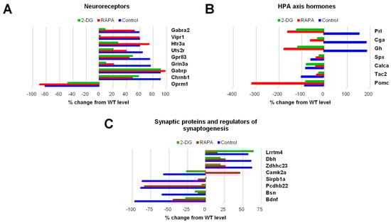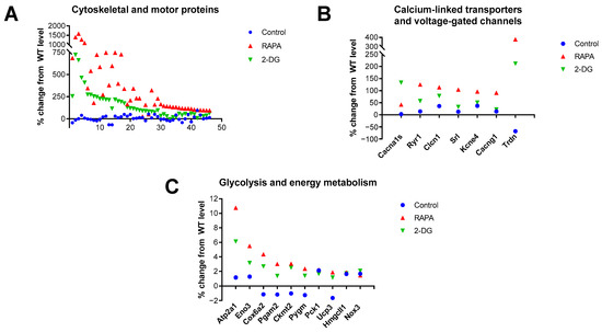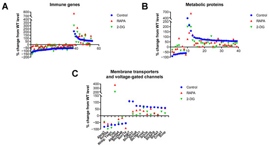 The third-largest group of genes/proteins that we identified in the analysis (6 downregulated and 11 upregulated) was represented by membrane transporters and voltage-gated channels (VGC), which are known to be vital for auditory processing [39] (Figure 2C, Table S5). The RAPA and 2-DG treatments also resulted in the normalization of gene expression in both the up- and downregulated groups.