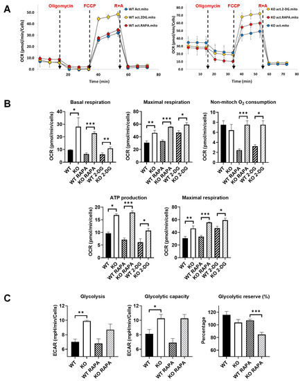 Figure 5. Comparative energetic metabolism of LPS-activated Fus1 KO and WT bone-marrow-derived macrophages (BMDMs) in the absence or presence of RAPA and 2-DG. (A) Graphs showing representative Seahorse mitochondrial stress test graphs of WT and KO BMDMs treated or not treated with energy-modifying drugs. Oligomycin (1 µM), FCCP (1 µM), R + A (rotenone + antimycin) (0.5 µM each) were injected at the time shown with the dashed lines. (B,C) Bar graphs showing quantified protein-normalized mitochondrial parameters calculated based on oxygen consumption rates (OCR) interrogated using the mitochondrial stress test (B) and extracellular acidification rates (ECAR) obtained through the glycolysis test (C). Glucose dependence was assessed by sequentially injecting oligomycin (1 µM), glucose (10 mM), and 2-deoxyglucose (2-DG, 50 µM). Data (n = 4 separate wells per group) represent 3 experiments. Rapamycin and 2-DG were added along with LPS (100 ng/mL) 4 h prior to performing the tests. OCR and ECAR data were analyzed with Student’s t-test. * = p < 0.05, ** = p < 0.01, *** = p < 0.001. Data are presented as mean ± SEM.