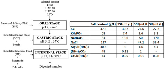 The methodology proposed by Minekus et al. [9] was followed for the simulation of the oral, gastric, and intestinal digestion stages. According to the protocol, the phases mixed in the successive stages must be kept in a 1:1 ratio (v/v). In this case, 5 g of sample, 5 mL of simulated salivary fluid (SSF), 10 mL of simulated gastric fluid (GSF), and 20 mL of simulated intestinal fluid (SIF) were added. The conditions and procedure are shown in Figure 1. Three repetitions for each type of sample (fresh almond bagasse (FRESH), hot air dried powder at 60 °C (HAD60), hot air dried powder at 70 °C (HAD70), and lyophilized powder (LYO) were performed.