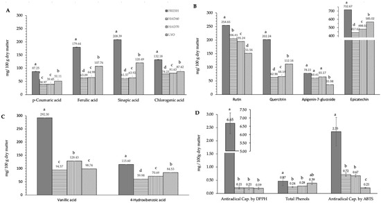 Effect of dehydration treatment on the polyphenols content and antiradical capacity. Phenolic compounds have been grouped according to their chemical structure: (A) hydroxycinnamic acid derivatives (p-coumaric acid, sinapic acid, ferulic acid and chlorogenic acid), (B) flavonoids and derivatives (rutin, quercetin-3-glucoside, quercitrin, epicatechin and apigenin-7-glucoside), (C) hydroxybenzoic acid derivatives (vanillic acid, 4-hydroxybenzoic acid). Section (D) includes antiradical capacity determined using DPPH and ABTS methods and total phenol content. FRESH: fresh almond bagasse; HAD60: hot air dried powder at 60 °C; HAD70: hot air dried powder at 70 °C; LYO: lyophilized powder. In section 2D, DPPH and ABTS results are expressed as mg Trolox/100 g dry matter; total phenols are expressed as mg galic acid/100 g dry matter. Different superscript letters mean statistically significant differences (p ≤ 0.05).
