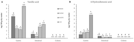 Hydroxybenzoic acid derivatives ((A) vanillic acid, (B) 4-hydroxybenzoic acid) content after gastric, intestinal, and colonic stages of in vitro gastrointestinal digestion. FRESH: fresh almond bagasse; HAD60: hot air dried powder at 60 °C; HAD70: hot air dried powder at 70 °C; LYO: lyophilized powder. Different superscripts letters mean statistically significant differences (p ≤ 0.05).