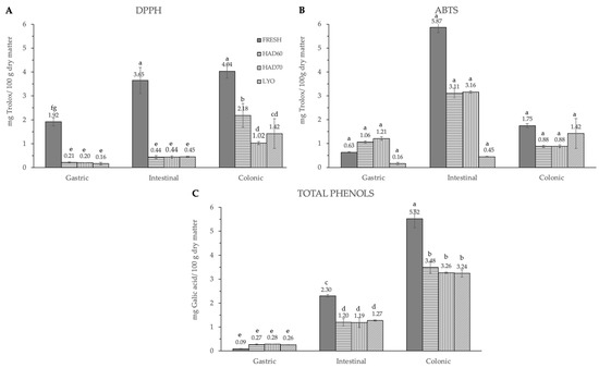 Antiradical capacity by DPPH (A), ABTS (B) methods and total phenols (C) after gastric, intestinal, and colonic stages of in vitro gastrointestinal digestion. FRESH: fresh almond bagasse; HAD60: hot air dried powder at 60 °C; HAD70: hot air dried powder at 70 °C; LYO: lyophilized powder. DPPH and ABTS results were expressed as mg Trolox/100 g dry matter. Total phenols were expressed as mg galic acid/100 g dry matter. Different superscripts letters mean statistically significant differences (p ≤ 0.05).