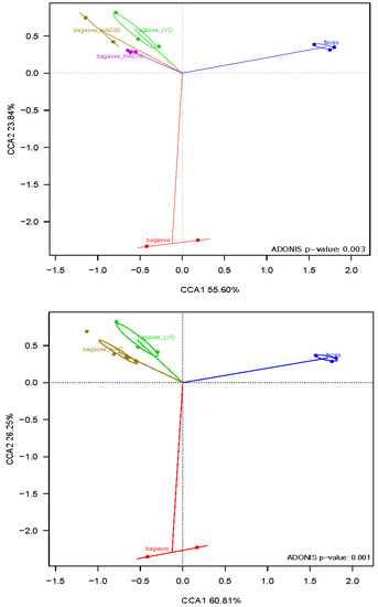Canonical correspondence analysis (CCA) and the adonis test (Figure 7) revealed a significant difference in the microbial community structures. As no significant differences were detected in the fermentative microbiota of air dried powder at 60 °C (HAD60) and air dried powder at 70 °C (HAD70) (p-value = 0.4), they were considered as a single air drying treatment for the analysis. The CCA showed the first axis, which explained 55.60% and 60.81% of the variability (Figure 7, and separated substrate-fermentation microbiota and controls (fermentations without substrates). The control overgrowth would be due to residual nutrients in the fecal samples used as inoculum. The second axis, explaining 23.84% and 26.25% of the variability, separated the bacterial community that grew on fresh bagasse from that which fermented the heat-treated (HAD) or lyophilized one (LYO).