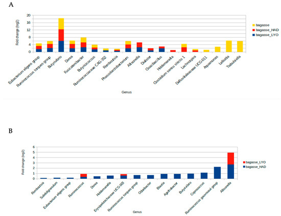 Bar plot of fold-changes of bacterial genera that are significantly increased in (A) pairwise comparisons with feces fermentations and in (B) pairwise comparisons with the fresh bagasse fermentations. Freeze-dried bagasse (bagasse_LYO), air-dried bagasse (bagasse_HAD), and fresh bagasse (bagasse).