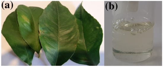 Digital image of Citrus limon leaves (a) and essential oil (LLEO) obtained by steam distillation of the leaves (b).