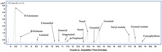 GC-MS analysis revealed the presence of 21 compounds and among them, limonene was found to be the major component, accounting for 256.7 ± 2.4 mg/mL, followed by citral at a concentration of 194.5 mg/mL, as the sum of oxygenated monoterpenes geranial (106.2 ± 1.6 mg/mL) and neral (88.3 ± 1.3 mg/mL). LLEO was also characterized by high amounts of myrcene (94.7 ± 1.9 mg/mL), neryl acetate (31.8 ± 0.9 mg/mL), linalool (24.5 ± 0.3 mg/mL), geranyl acetate (23.5 ± 0.9 mg/mL), and 3-carene (20.6 ± 1.2 mg/mL). Other components, with relatively small amounts, were beta-ocimene, citronellal, alpha-terpineol, nerol, and terpinene-4-ol.