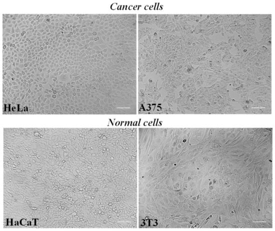 The panel shows representative images of phase contrast of human cancer HeLa cells, A375 human melanoma cells, human HaCaT keratinocytes, and 3T3 normal murine fibroblasts. Bar = 100 μm.