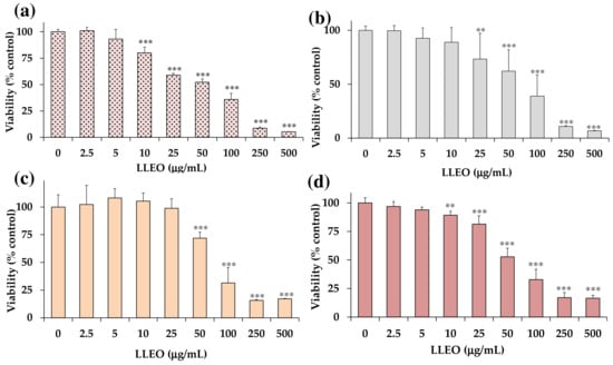 Figure 4 shows the viability, expressed as % of the control (0), induced by incubation for 24 h with different amounts (2.5–500 μg/mL) of LLEO in human cancer HeLa cells (Figure 4a), A375 human melanoma cells (Figure 4b), healthy human HaCaT keratinocytes, (Figure 4c), and 3T3 normal murine fibroblasts (Figure 4d) by MTT assay.