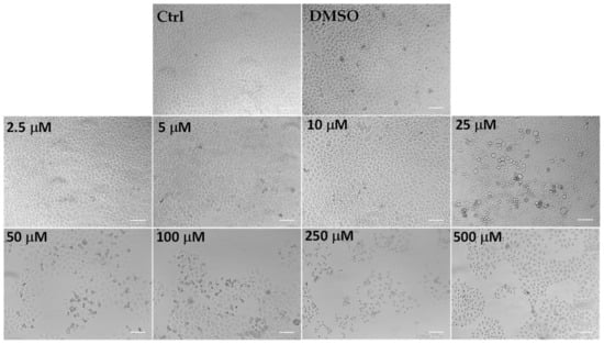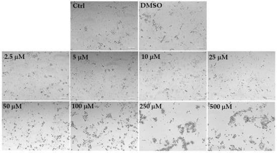 The addition of LLEO induced evident dose-dependent changes in HaCaT cell morphology with respect to control cells from the concentration of 50 μg/mL, as there was a remarkable increase in the number of rounded cells (apoptotic cells) and the occurrence of cell debris, shrunken and floating cells, signs indicative of cytotoxicity and cell death. Vehicle-treated cells (DMSO) showed the same morphological traits as control cells. These findings support the data recorded in the viability assay.