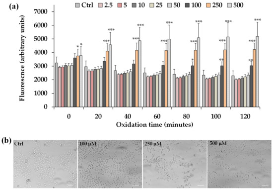Figure 7a shows the time-dependent intracellular ROS generation measured during 2 h of incubation in control HeLa cells and cells treated with LLEO (2.5–500 μg/mL), while the panel of Figure 7b reports the representative images of phase contrast of control cells and cells after 2 h treatment with LLEO at 100, 250, and 500 μg/mL.