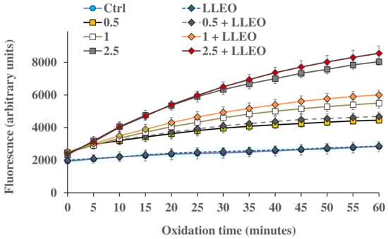 Figure 8 shows the intracellular ROS generation measured at different time points in control HaCaT cells and cells exposed for 1 h to H2O2 (0.5, 1, and 2.5 mM) in the absence and in the presence (24 h of pre-incubation) of LLEO (10 μg/mL).
