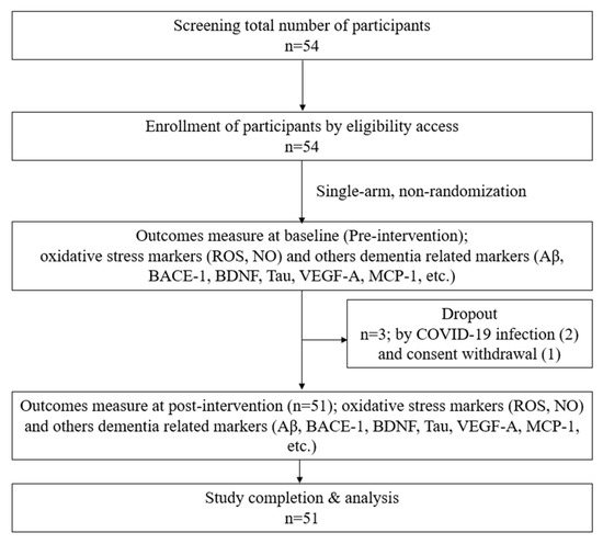 A crucial component of clinical trial inclusion criteria is the use of biomarkers that reliably identify the pathology of Alzheimer’s disease (AD) over the course of an individual’s lifetime. The prevalence of AD is 3% at the age of 65 years, which doubles every 5–6 years [1]. By 2025, South Korea is expected to have a super-aged society, only 8 years after becoming an elderly society. By the year 2045, the proportion of elderly persons is anticipated to increase by 37% [2]. Globally, approximately 50 million people suffer from dementia, with nearly 10 million new cases diagnosed every year [1]. The prevalence of dementia among individuals over 65 years of age in Korea was predicted to be 10.25% in 2020, or approximately 830,000 individuals. However, it is predicted to increase by about 15.91% by 2050, with an additional 3.02 million dementia sufferers [2]. Thus, effective therapeutic and preventive strategies are required to overcome the challenges of this global issue. The most common form of dementia-related neuropathological brain changes can reportedly begin as early as 20 years before symptoms appear; these can be further evaluated with potential biomarkers to determine treatment measures [3]. Normal metabolism in biological systems involves the production of reactive oxygen species (ROS). Free radicals are highly reactive entities that can initiate a chain of reactions that damage the cell. Nevertheless, even under ideal circumstances, cells biologically create free radicals, which are typically neutralized by endogenous enzymatic cellular antioxidant processes [4]. In patients with AD, oxidative stress and cellular damage brought on by protein, lipid, and DNA oxidation appear to precede the development of cognitive deterioration [5]. Therefore, it is important to identify such patients in the community using thorough evaluation that includes biomarker testing, quick cognitive assessments, and confirmatory neurocognitive testing. Because blood-based biomarkers are less invasive, low-risk, and aim for an overall accuracy comparable to that of the more established cerebrospinal fluid (CSF) biomarkers, those directly linked to the pathogenesis of AD have recently become the focus of intense research. Because it causes oxidative stress in the brain, amyloid beta (Aβ), majorly contributes to neurodegeneration in patients with AD [6,7]. The abnormal production and aggregation of Aβ isoforms are pathophysiological hallmarks that start decades before symptoms appear, causing synaptic loss, neuronal death, and clinical dementia. Aβ is the most studied blood biomarker (either plasma or serum). Thus, monitoring amyloid processes in asymptomatic individuals may help identify those who develop AD at the prodromal stage [8]. In addition, other potential biomarkers for the early detection of AD pathology have been found, such as plasma proteins, lipids, Aβ-40, Aβ-42, and their ratio, tau, and beta-secretase 1 (BACE-1) [9,10]. Neurotrophins, such as the brain-derived neurotrophic factor (BDNF), may also be involved in AD pathogenesis [11]. Additionally, reactive astrocytes are linked to the active production of several pro-inflammatory and toxic mediators in the brain of patients with AD, which can result in synaptic dysfunction [12,13]. Interleukin-6 (IL-6) and other inflammatory molecules are also linked to AD [14]. Pathological alterations in AD are linked to the upregulation of several chemokines, including monocyte chemotactic protein-1 (MCP-1) [15]. Age has been linked to higher MCP-1 levels in the Japanese community, which is likely influenced by the aging population [15]. Vascular endothelial growth factors (VEGFs) play a role in the development and maintenance of both vascular and neural cells [16]. Elevated blood–brain barrier (BBB) permeability, pericyte loss, and severe tangle pathology have been linked to increased VEGF levels in the brain of patients with AD [17,18].