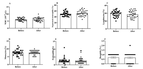 WBCs are important for both the innate and adaptive immune responses in the body. We did not find any significant changes in the total and differential WBC counts between the post- and pre-treatment values (Figure 2A–F).