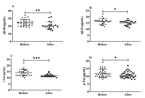 Neurofibrillary amyloid plaques, abnormal protein deposits made up of Aβ peptides (Aβ1-40 and Aβ1-42), and build-up of intracellular insoluble hyperphosphorylated tau proteins (p-Tau) that are the hallmarks of AD brain pathology. Herein, we evaluated how exposure to H2 gas affects the serum levels of Aβ peptides (Aβ1-40, Aβ1-42), t-tau, and p-Tau on community-dwelling adults of various ages. There were significant differences found in all biomarkers, such as Aβ1-40 (p < 0.01), Aβ1-42 (p < 0.05), t-tau (p < 0.001), and p-Tau (p < 0.05), after treatment compared to before treatment (Figure 6). Our results demonstrated that the dementia marker, (Aβ1-40 and Aβ1-42), levels reduced significantly on community-dwelling individuals of various ages after 4 weeks of treatment; (Aβ1-40 and Aβ1-42; 50–59 years; * p < 0.05, 60–69 years; * p < 0.05; 70–79 years; * p < 0.05) are shown in Figure S3; similarly, t-tau and p-tau levels reduced dramatically in different ages within 4 weeks of treatment; (60–69 years; ** p < 0.01; 70–79 years; * p < 0.05) are shown Figure S4.