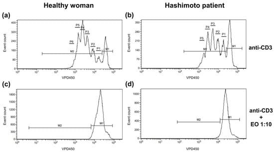 Our findings showed that the proliferation of CD4+ and CD8+ T cells from healthy women and HT patients is significantly inhibited mainly in the presence of the lowest (1:10) NSEO dilution; the number of cell divisions reduced, and the percentage of dividing cells decreased. In our previous work, we used a different stimulation protocol in which NSEO was added simultaneously with anti-CD3 antibody, which resulted in a much more significant reduction in the percentage of proliferating T cells from healthy people, observed even at higher NSEO dilutions (1:50 and 1:100) [29]. Thus, adding NSEO before stimulation has a much stronger effect, probably due to the inhibition of T cell activation through the TCR/CD3 complex. Meanwhile, the effect of NSEO on previously activated T cells is weaker due to earlier activation of specific signaling pathways essential for their function.