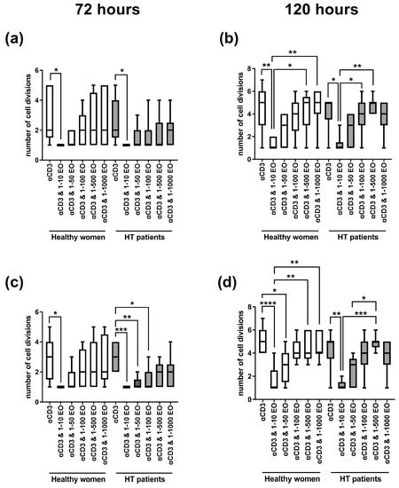 Figure 2 presents the number of cell divisions of lymphocytes stimulated with immobilized monoclonal anti-CD3 antibody in the presence of different EtOH dilutions of NSEO. In healthy women, a decrease in the number of cell divisions of CD4+ (Figure 2a) and CD8+ (Figure 2c) cells after 72 h of stimulation was observed in the presence of the lowest (1:10) dilution of NSEO compared to cells stimulated with anti-CD3 antibody alone. In HT patients, there was also a decrease in the number of cell divisions of CD4+ and CD8+ cells in the presence of 1:10 NSEO dilution after 72 h of stimulation. Additionally, there was a decrease in the number of cell divisions of CD8+ cells in the presence of 1:50 and 1:100 NSEO in HT patients after 72 h (Figure 2c). After 120 h, there was also a decrease in the number of cell divisions of CD4+ (Figure 2b) and CD8+ (Figure 2d) cells from HT patients and healthy women when cells were incubated with 1:10 NSEO dilution. Significant differences were also seen between higher NSEO dilutions (1:500 and 1:1000) and 1:10 NSEO dilution, especially in healthy women.