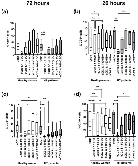 Comparison of the percentage of proliferating CD4+ (a,b) and CD8+ (c,d) cells stimulated with anti-CD3 antibody alone (control) or with different dilutions of NSEO for 72 (a,c) and 120 (b,d) hours in healthy people and HT patients. Graphs show the median, percentiles with the maximum and minimum values, and ANOVA Friedmann with Dunn’s post hoc test; * p < 0.05, ** p < 0.01, *** p < 0.001, **** p < 0.0001.