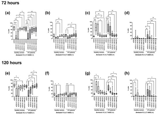 Comparison of the percentage of living, apoptotic (early and late), and necrotic lymphocytes stimulated for 72 (a–d) and 120 (e–h) hours with anti-CD3 antibody (control) with different dilutions of NSEO in healthy people and HT patients. Graphs show the median, percentiles with the maximum and minimum values, and ANOVA Friedman with Dunn’s post hoc test; * p < 0.05, ** p < 0.01, *** p < 0.001, **** p < 0.0001.