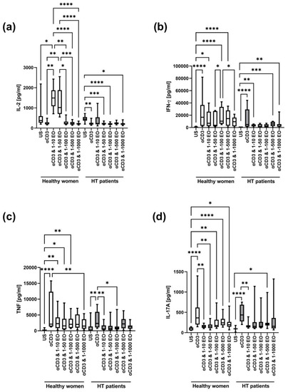 Comparison of Th1 and Th17 cytokine levels produced by cells stimulated for 72 h with anti-CD3 antibody with different dilutions of NSEO in healthy controls and HT patients. Graphs show the levels of IL-2 (a), INF-γ (b), TNF (c), and IL-17A (d). Graphs show the median, percentiles with the maximum and minimum values, and ANOVA Friedmann with Dunn’s post hoc test; * p < 0.05, ** p < 0.01, *** p < 0.001, **** p < 0.0001. US—unstimulated.