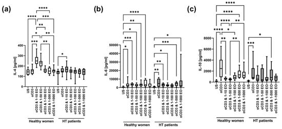 In healthy women and HT patients, there was an increase in IL-17A levels after stimulation with anti-CD3 antibody compared to the unstimulated control (Figure 5d). In healthy women, IL-17A levels decreased in the presence of 1:10 and 1:50 NSEO dilutions compared to anti-CD3 antibody. In addition, IL-17A levels increased in the presence of 1:100, 1:500, and 1:1000 NSEO compared to the unstimulated control, but the levels were visibly lower compared to anti-CD3 antibody alone. In HT patients, IL-17A levels decreased in the presence of 1:10 NSEO, but in the presence of 1:500 NSEO, IL-17A levels increased compared to the unstimulated control.