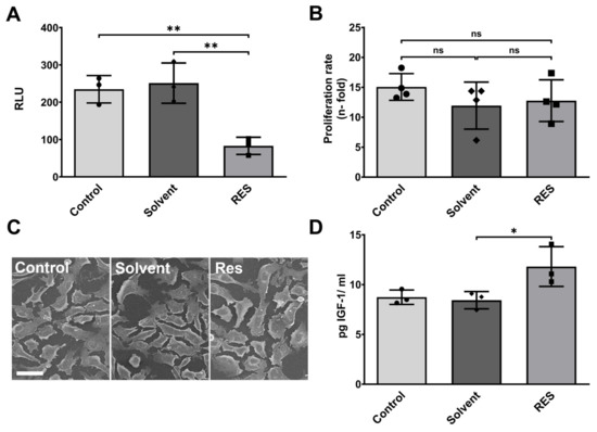 Resveratrol rapidly reduces inflammasome activity and induces IGF-1 secretion without influencing cell proliferation or morphology. (A) Caspase-1-activity-based inflammasome luminescence assay shows that the 6 h resveratrol treatment decreases inflammasome activity. (B) The 100 µM resveratrol treatment does not have any significant effect on cell growth over 24 h. Proliferation rate calculated as an n-fold increase in the initially seeded cell number. (C) Representative scanning electron images (SEM) (scale bar: 50 µm) display a similar cell morphology after 24 h. (D) ELISA of IGF-1 concentrations in cell supernatant reveals higher IGF-1 concentrations after the 24 h resveratrol treatment. HMC3 was co-treated with/without 100 µM resveratrol (RES) and compared to the untreated control. Solvent = PEG400; RLU = relative light unit; n = 3/4 number of independent cell cultures; ns = not significant, * p < 0.05 and ** p < 0.01.