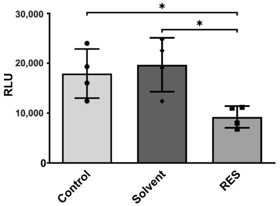 Lower glucose consumption after resveratrol treatment. Glucose uptake luminescence assay indicated a reduced glucose consumption in samples treated with resveratrol. HMC3 was co-treated with/without 100 µM resveratrol (RES) for 24 h and compared to untreated control. Solvent = PEG400; RLU = relative light unit; n = 4 number of independent cell cultures. * p < 0.05.