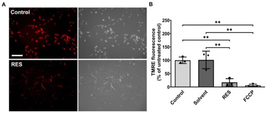 To delineate the effects of resveratrol on mitochondrial function (Figure 3), changes in the membrane potential were investigated using a tetramethylrhodamine-ethyl ester (TMRE)-based method. TMRE accumulates in active mitochondria due to their negative charge. Once mitochondria become less active, they depolarize, and fewer TMREs accumulate in the mitochondria. After 24 h of treatment with resveratrol (100 µM), the observed fluorescent intensity significantly decreased (p < 0.01) in comparison to untreated controls, indicating that resveratrol drastically reduced mitochondrial activity. Nevertheless, the measured fluorescence was still three-fold higher than the fluorescent intensity of the ionophore uncoupler of oxidative phosphorylation carbonyl cyanide 4-(trifluoromethoxy) phenylhydrazone (FCCP) (Figure 3B). Therefore, mitochondria were still alive and functioning after the resveratrol treatment.