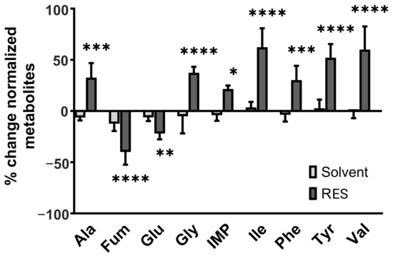 The quantification of metabolites after the resveratrol treatment revealed significant changes in metabolite concentrations compared to untreated controls (Figure 5). The concentrations of essential amino acids valine (Val, p < 0.0001), isoleucine (Ile, p < 0.0001), phenylalanine (Phe, p < 0.001), and tyrosine (Tyr, p < 0.0001) were all found to be significantly increased compared to the untreated controls—by 40% or more. Moreover, the concentration of fumarate—which is a product of tyrosine and phenylalanine depletion [31,32]—was reduced by half compared to untreated controls (Fum, p < 0.0001). The metabolite concentration of non-essential amino acids glycine (Gly, p < 0.0001) and alanine (Ala, p < 0.001) also increased by 30%. Glutamate, in contrast, showed a 20% lower concentration after resveratrol treatment (Glu, p < 0.01).