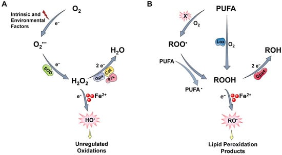 Reactive species are also generated through lipid peroxidation, a process under which highly reactive radicals such as HO• attack lipids, especially polyunsaturated fatty acid (PUFA) side chains [21]. The process begins with the incorporation of O2 and the generation of lipid hydroperoxides (ROOH), a reaction that can proceed either enzymatically or non-enzymatically (Figure 1B). In the first case, PUFA serves as a substrate for lipoxygenase enzyme (LOX), which forms hydroperoxyl groups (ROOH) at the carbon position of allylic chains. In the second case, a reactive free radical, such as HO•, which is mainly generated through Fenton-type reactions, abstracts a hydrogen atom from a methylene (-CH2-) group, forming a carbon radical. These reactions are favored in bis-allylic positions; that means, the more double bonds, the more oxidizable the PUFA. The most likely fate of a carbon radical is to react with O2, generating a peroxyl radical (ROO•). The latter, if not scavenged, attacks an adjacent fatty acid side chain, generating a new carbon radical, which can, in turn, react with O2,propagating lipid peroxidation chain reactions, while ROO• itself abstracts a hydrogen atom to form a lipid hydroperoxide (ROOH). ROOH are not highly reactive and can be safely reduced to their corresponding innocuous alcohols via glutathione peroxidase 4 (GPx4), an enzyme that acts on peroxidized fatty acids located within membranes and lipoproteins. Yet, like H2O2, if ROOH levels elevate and Fe2+ is available, highly reactive alkoxyl radicals (RO•) are generated. The latter are extremely potent species, capable of oxidizing new PUFA, amplifying the lipid peroxidation process. The continued production of lipid ROO• and RO•, and their decomposition to produce end-products of peroxidation (such as isoprostanes, malondialdehyde, and 4-hydroxy-2-nonenal) have detrimental effects on cellular membranes and play a critical role is cell death pathways including apoptosis and ferroptosis [22,23,24].