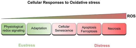 Cellular responses to oxidative stress. Free radicals and other reactive intermediates formed as by-products of cellular aerobic metabolism are continuously generated by endogenous or exogenous sources and eliminated by reducing defense systems. At low steady-state levels, by oxidizing specific targets, ROS regulate signaling pathways implicated in various physiological processes. It follows that defense systems coordinately attenuate ROS to minimize oxidative damage, whilst permitting enough to remain to fulfill useful roles (eustress). However, deviation from this steady state leads to unspecific oxidation, disrupting redox signaling and/or causing macromolecular damage (distress). Depending on the severity of the damage, cell responses can range from permanent growth arrest (cellular senescence) to programmed cell death (apoptosis or ferroptosis), or in more extreme conditions, necrotic cell death. Adaptive responses that modulate ROS levels and counteract damaging effects can also be elicited.
