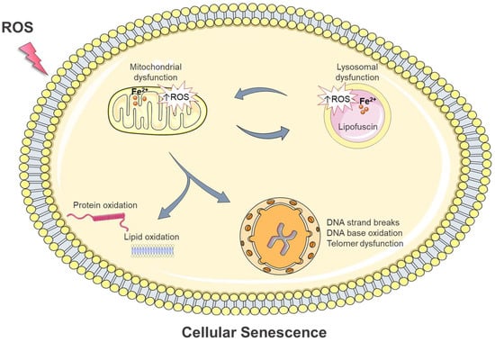 ROS are common drivers of cellular senescence. Excess ROS can oxidize all essential macromolecules (DNA, lipids, proteins) and impair lysosomal and mitochondrial function [7,8,9]. These effects are common features of cellular senescence. It has to be emphasized, however, that ROS is an umbrella term for a group of molecules with varying chemical reactivity: some are strong oxidizing agents, and some are not [10]. A requirement for the generation of extremely damaging ROS is the availability of labile (redox-active) iron, which catalyzes the conversion of relatively weak oxidants to highly reactive free radicals [11]. Thus, the diminution of labile iron may reduce their generation and their subsequent adverse effects. In the present review article, we focus our interest on the underlying mechanisms that contribute to ROS-induced cellular senescence. Special attention is given to the potential role of labile iron in this process.